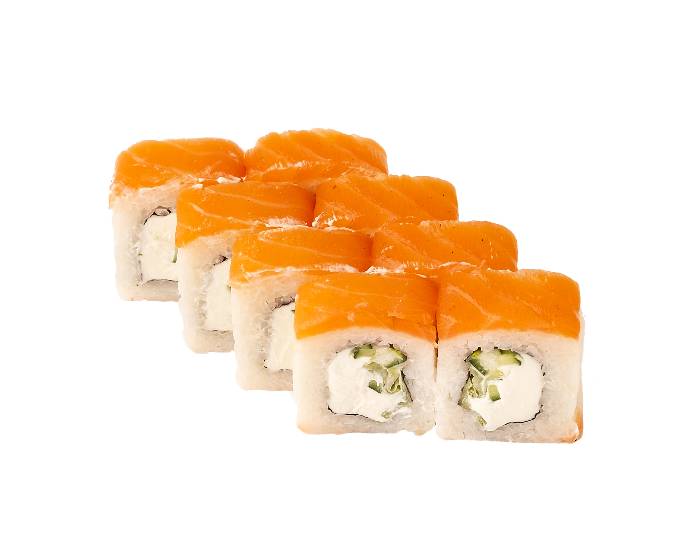 ролл с копченым филе лосося, огурцом, листом салата, сливочным сыром