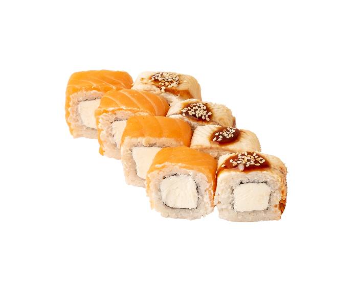 ролл с нежным лососем, копченым угрем, сливочным сыром, соусом Унаги, кунжутом