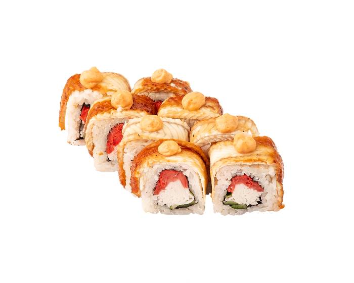 ролл с угрем, огурцом, имбирем, снежным крабом, пикантным соусом
