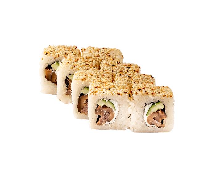 аппетитный ролл с обжаренными грибами, сливочным сыром, отварной говядиной, свежим огурцом, кунжутом