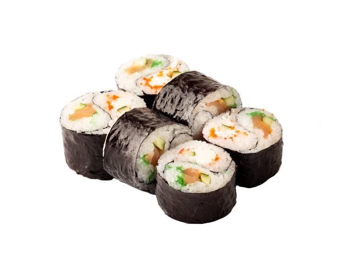 ролл с крабом, свежим огурцом, лососем х/к, огранжевым и зеленым тобико