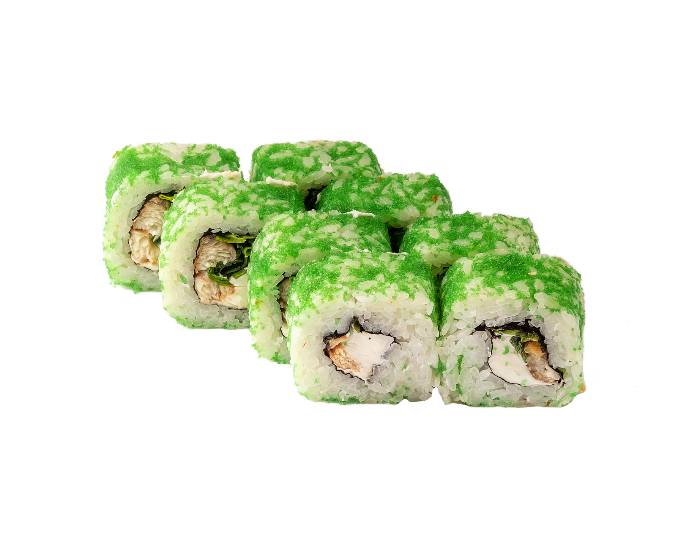ролл с угрем, сливочным сыром, соусом Спайси, оранжевой тобико, зеленой тобико, зеленым луком