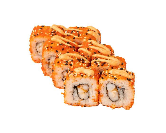ролл с жареной креветкой, в обсыбке из икры тобико, кунжутом, под спайс-соусом