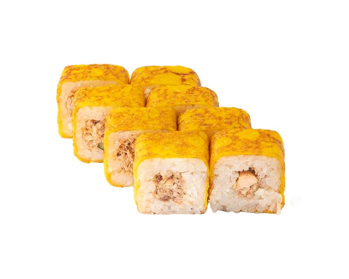ролл с обжаренным лососем в устричном соусе, огурцом, японским омлетом, соусом Спайс