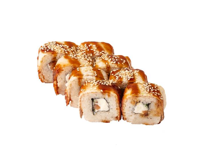 изысканный ролл со сливочным сыром, нежнейжим филе лосося, копченого угря, икрой тобико, кунжутом, соусом Унаги