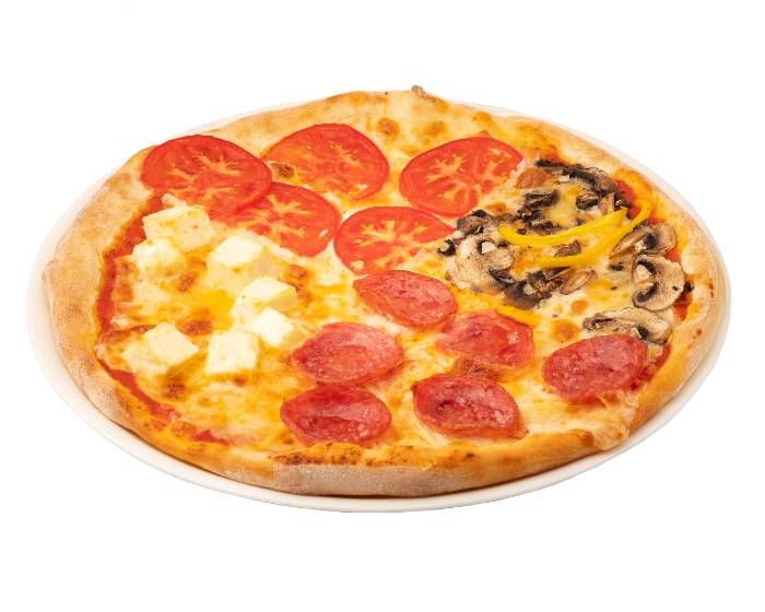 соус маринара, шампиньоны, пепперони говяжья, сыр брынза, сыр моцарелла, помидоры, орегано