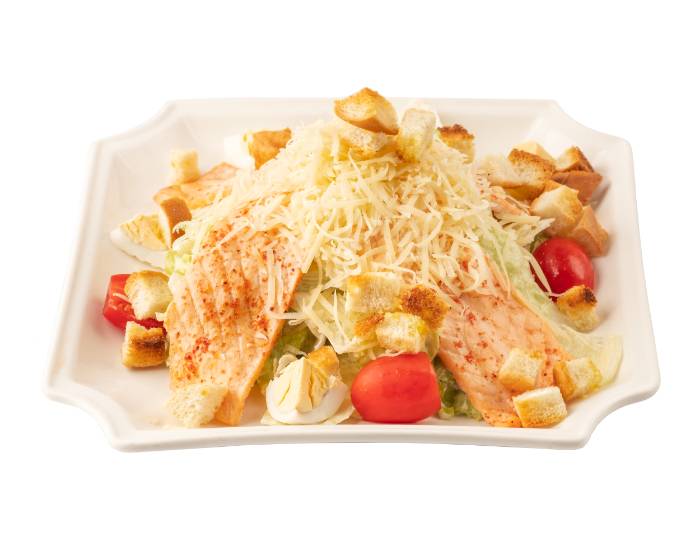 жареный лосось, помидоры Черри, салат Айсберг, перепелиные яйца, сыр Пармезан, чесночные гренки, соус Цезарь