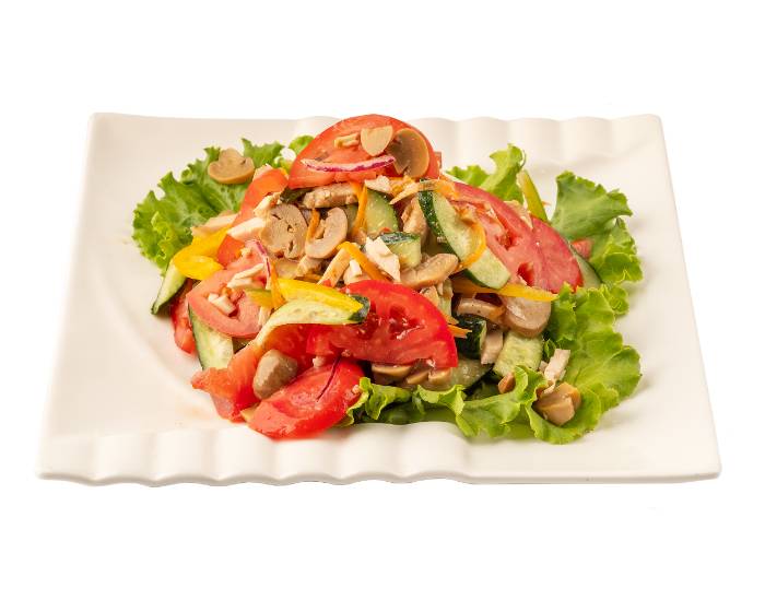 болгарский перец, огурцы, морковь, копченая курица, помидоры, маринованные шампиньоны, масло растительное