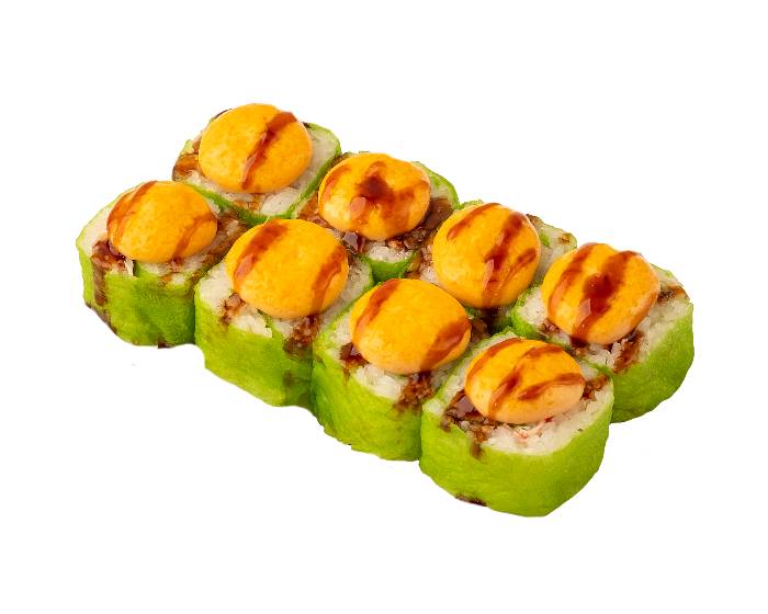 ролл с пресованным зеленым тофу, крабовым миксом, копченым угрем, соусом Лава